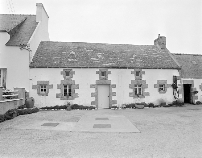 Meil Kerharo, maison en rez-de-chaussée et comble à surcroit éclairé par trois jours rectangulaires. Elévation antérieure. (1977)Immatriculation