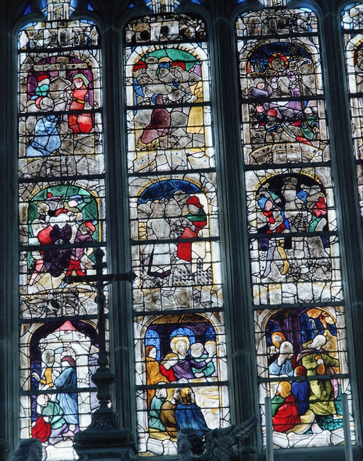 Panneaux c 1 à 6, d 1 à 6, e 1 à 6; la Cène, l'Arrestation, le Christ devant Caïphe, descente de croix, mise au tombeau, Résurrection.Immatriculation