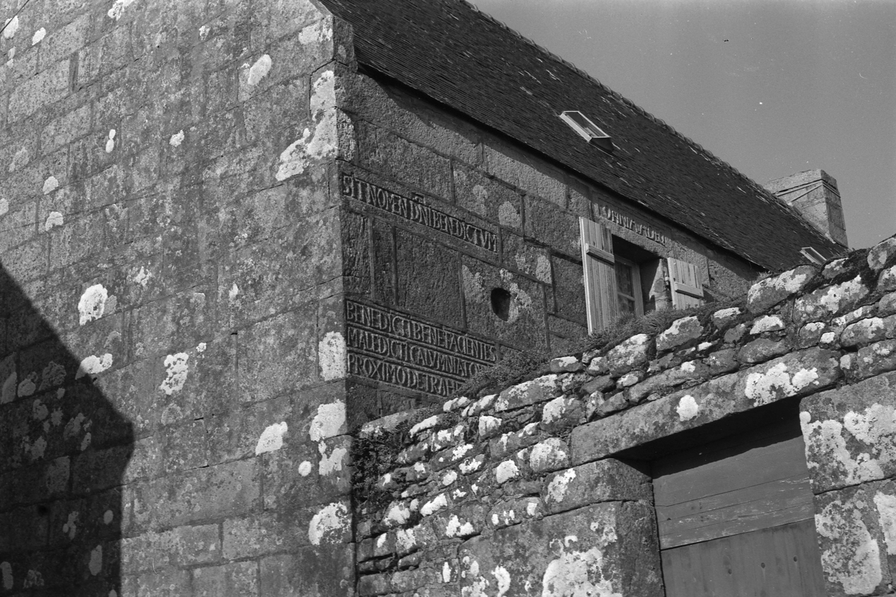 Elévation antérieure du logis daté 1661, occulus et inscriptions, vue prise de la ruelle. (1977)Immatriculation