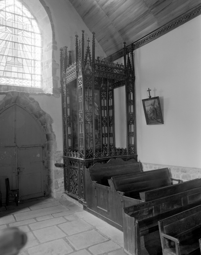 Ensemble de mobilier néogothique : autel, retable de la Vierge ; clôture, confessionnal, baldaquin des fonts baptismaux, fonts baptismaux, tableau : Baptême du christ (Chauvigné),