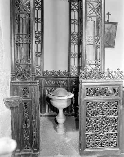 Ensemble de mobilier néogothique : autel, retable de la Vierge ; clôture, confessionnal, baldaquin des fonts baptismaux, fonts baptismaux, tableau : Baptême du christ (Chauvigné),