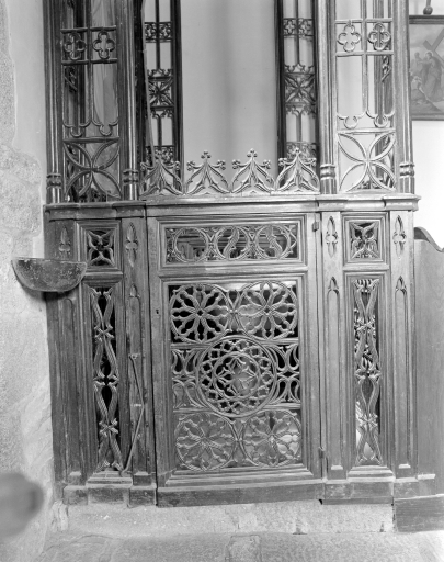 Ensemble de mobilier néogothique : autel, retable de la Vierge ; clôture, confessionnal, baldaquin des fonts baptismaux, fonts baptismaux, tableau : Baptême du christ (Chauvigné),