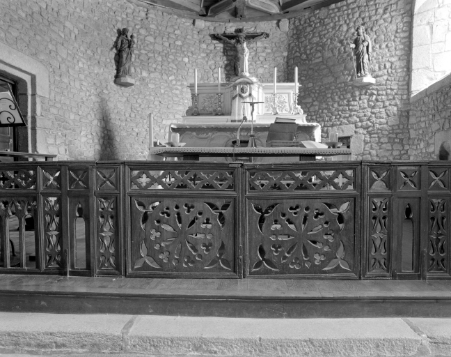 Ensemble de mobilier néogothique : autel, retable de la Vierge ; clôture, confessionnal, baldaquin des fonts baptismaux, fonts baptismaux, tableau : Baptême du christ (Chauvigné),