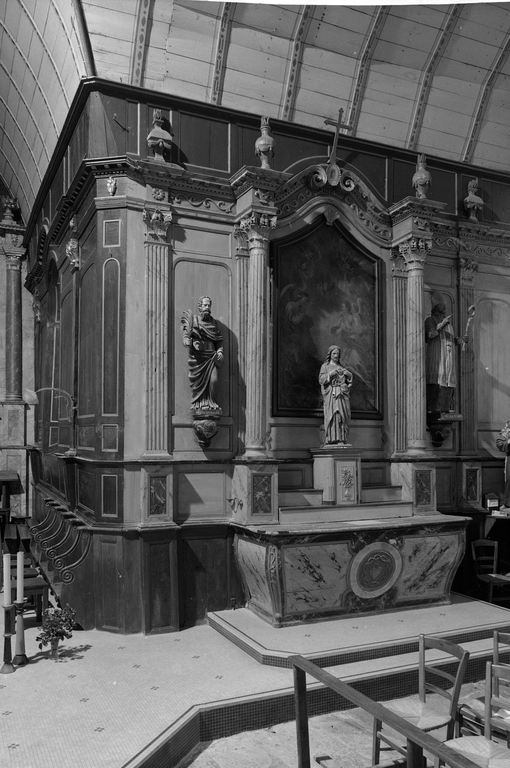 Ensemble de l'autel du Sacré-Coeur : autel, retable, tabernacle, 2 gradins d'autel, degré d'autel, tableau d'autel : Coeur du Christ adoré par les anges (La Fontenelle fusionnée en Val-Couesnon en 2019),