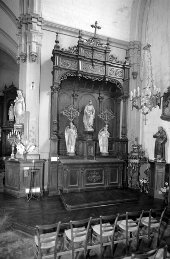 Ensemble de mobilier : maître-autel et son retable, autel-retable de la Vierge, autel-retable de saint Joseph, 3 stalles, chaire à prêcher, confessionnal (Noyal-sous-Bazouges),