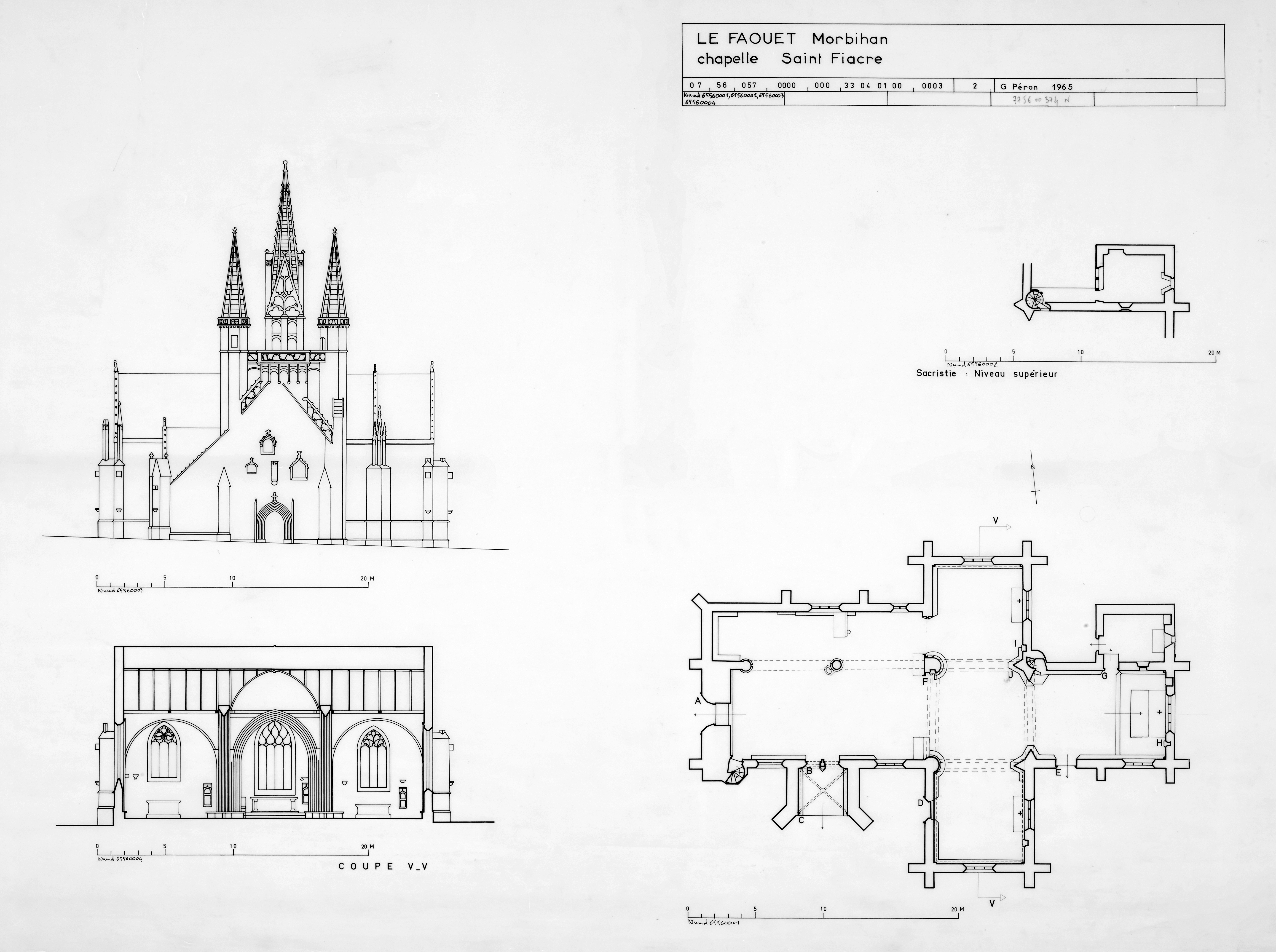 Elévation de la façade ouest, coupe transversale sur le transept, plan au sol et de l'étage de la sacristie.Immatriculation