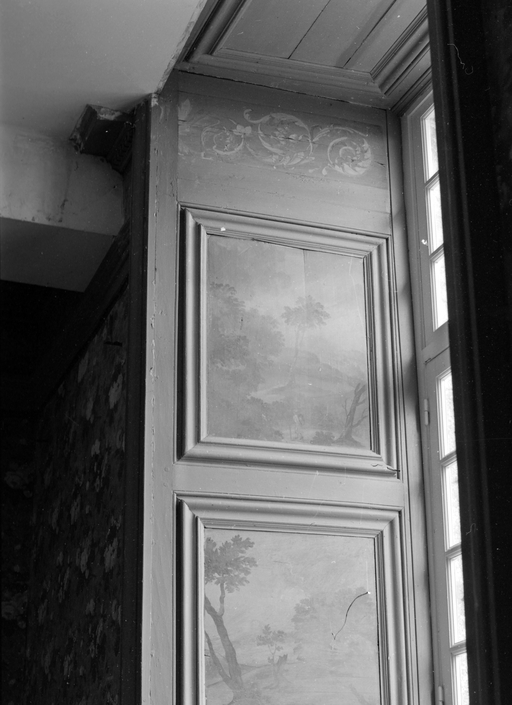 Panneaux peints logis, chambre 1er étage, embrasure gauche fenêtre.Immatriculation