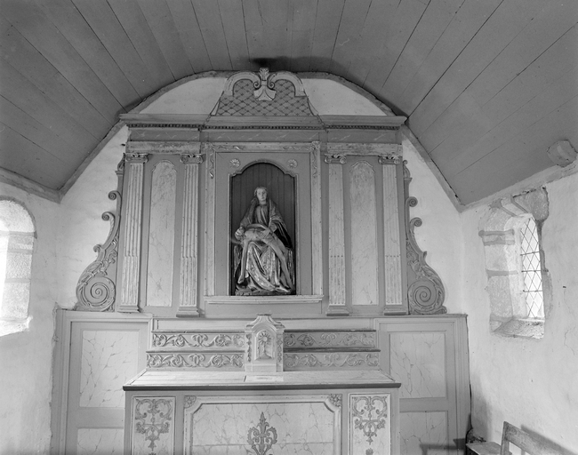 Autel, retable, tabernacle, gradins d'autel (2) (maître-autel, retable à panneau compartimenté), chapelle de Langroas, de Sainte-Croix, Notre-Dame-de-Pitié, Notre-Dame-des-Sept-Douleurs (Cléden-Cap-Sizun),