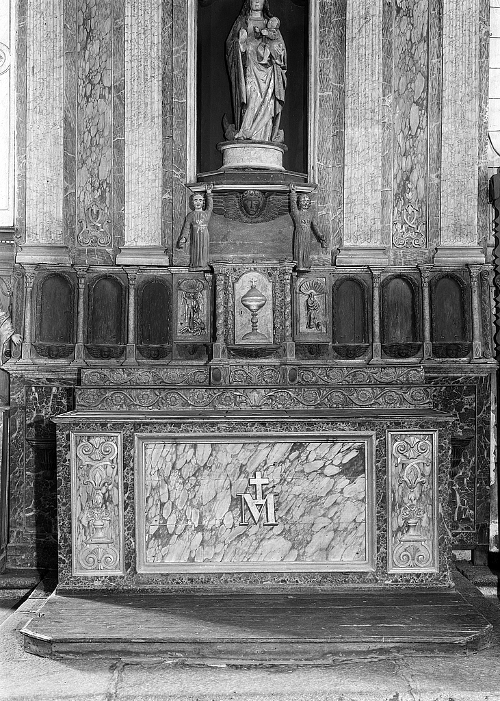 Autel, tabernacle, gradins d'autel (2), retable, porte-cierges (2), de la Vierge, église paroissiale Saint-Primel (Primelin),