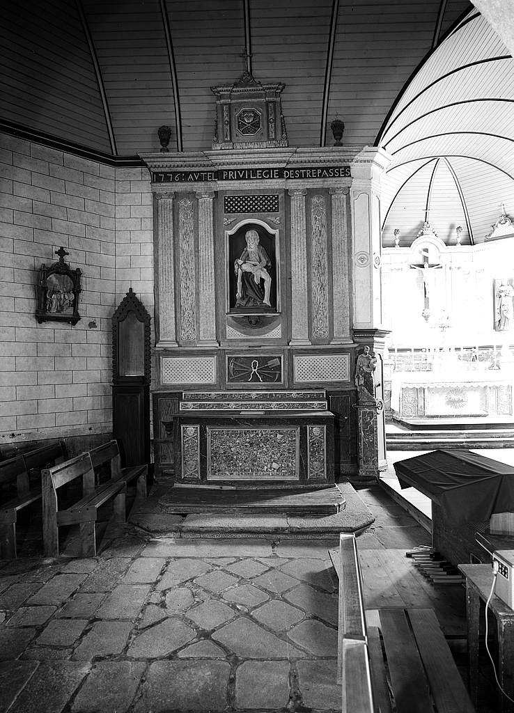 Autel, gradins d'autel (2), retable (autel secondaire, autel tombeau, retable à panneau compartimenté, retable architecturé à niche), des trépassés, église paroissiale Saint-Primel (Primelin),