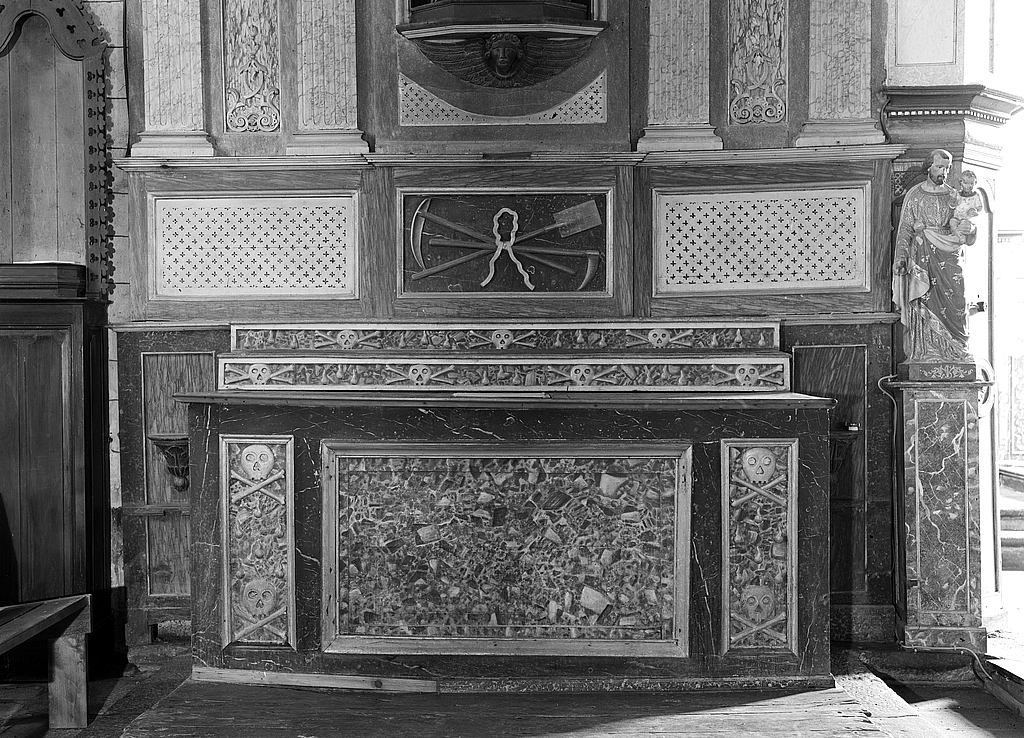 Autel, gradins d'autel (2), retable (autel secondaire, autel tombeau, retable à panneau compartimenté, retable architecturé à niche), des trépassés, église paroissiale Saint-Primel (Primelin),