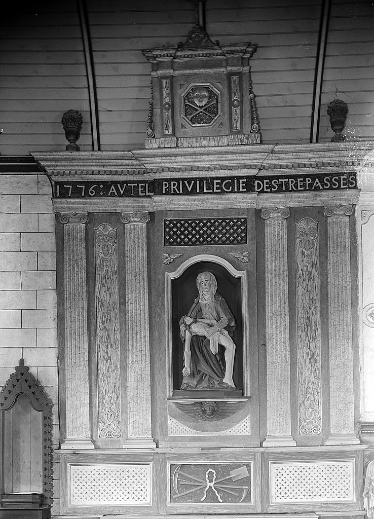 Autel, gradins d'autel (2), retable (autel secondaire, autel tombeau, retable à panneau compartimenté, retable architecturé à niche), des trépassés, église paroissiale Saint-Primel (Primelin),