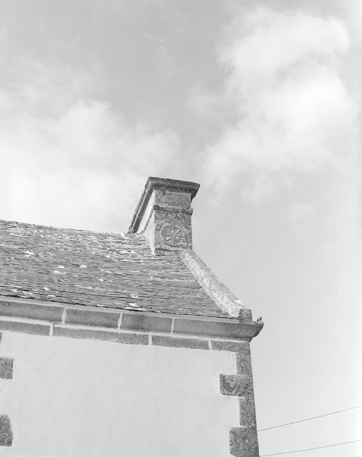 Kerlazen, ferme 1, façade antérieure du logis, détail de la souche de cheminée est et inscription. (1978)Immatriculation
