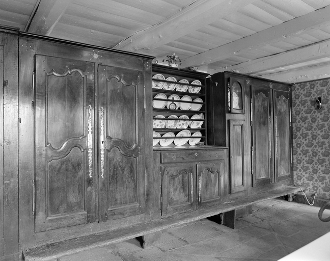 Mur nord, front des armoires 1 : armoires, horloge, buffet-vaisselier et "bank koste'n ti". (1978)Immatriculation