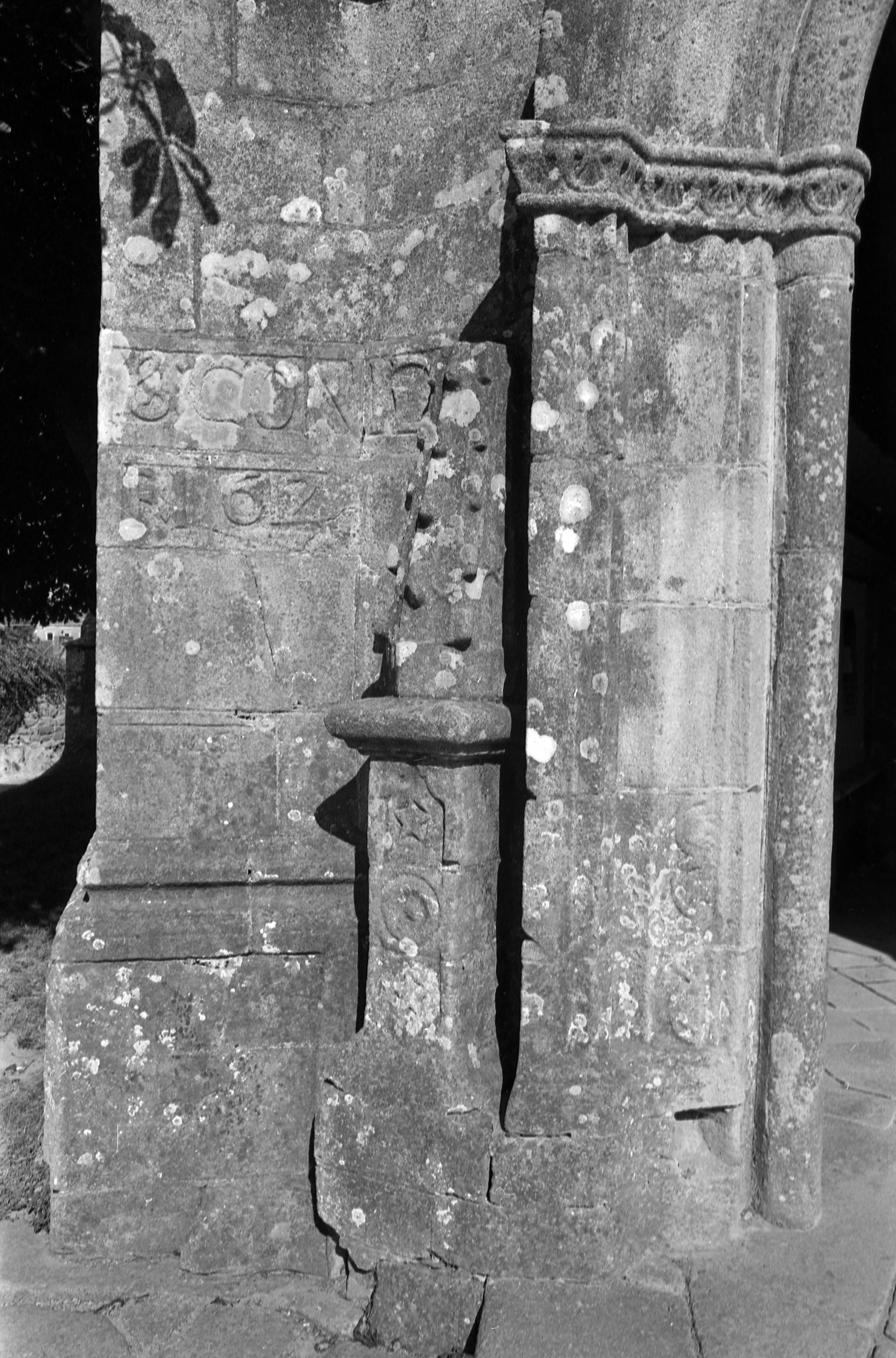 Porche sud, détail du jambage ouest et inscription : Y. GONID(ec) F 1612. (1978)Immatriculation