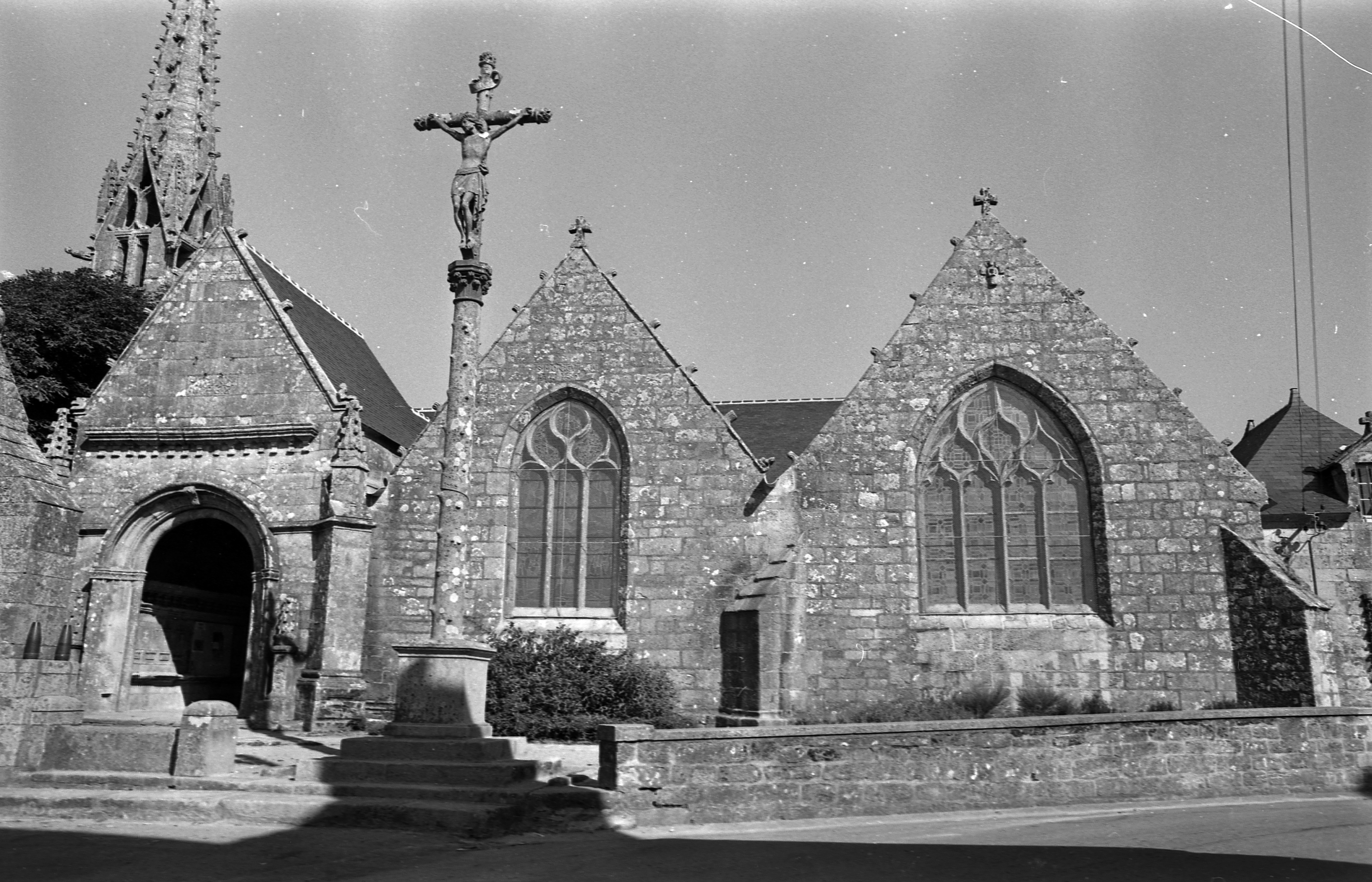 Vue générale prise du sud, église et croix monumentale. (1978)Immatriculation