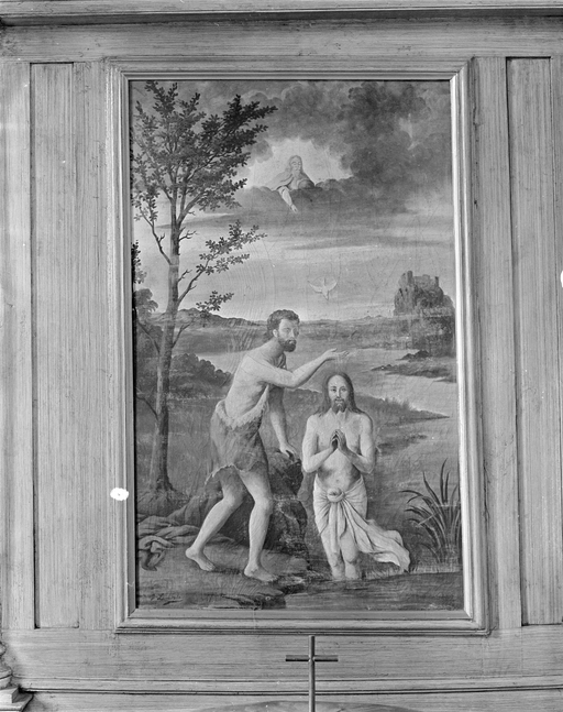 Fonts baptismaux ; baldaquin des fonts baptismaux ; tableau : Baptême du Christ (La Fontenelle fusionnée en Val-Couesnon en 2019),