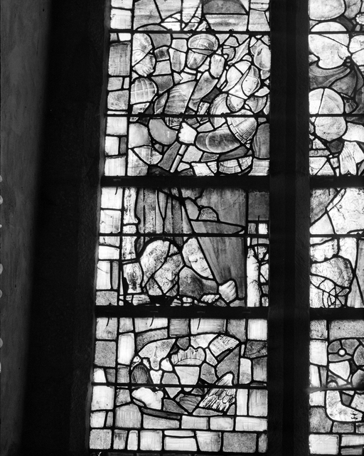Mur nord, vitrail : La Crucifixion, détail des personnages à gauche.Immatriculation