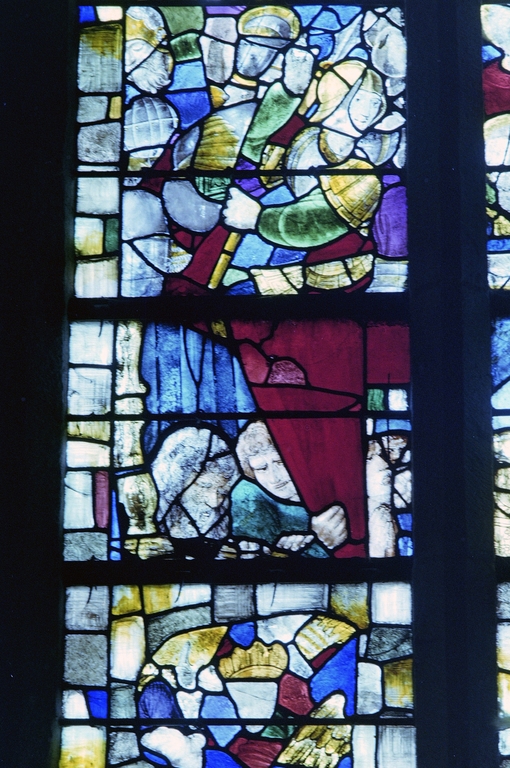 Mur nord, vitrail : La Crucifixion, détail des personnages à gauche.Immatriculation