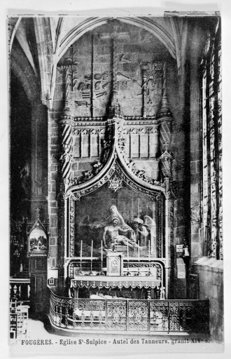 Vue intérieure, autel des tanneurs (Carte postale ancienne, BM Fougères).Immatriculation