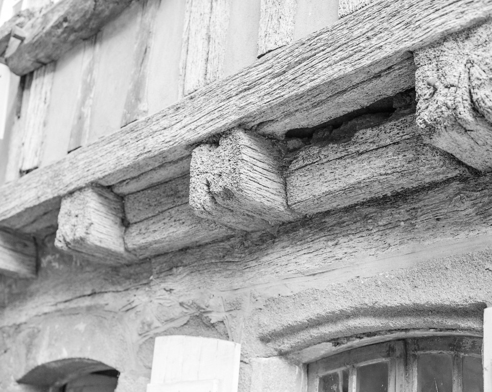Les entretoises conservées au rez-de-chaussée sont de simples blocs de bois équarris.Immatriculation