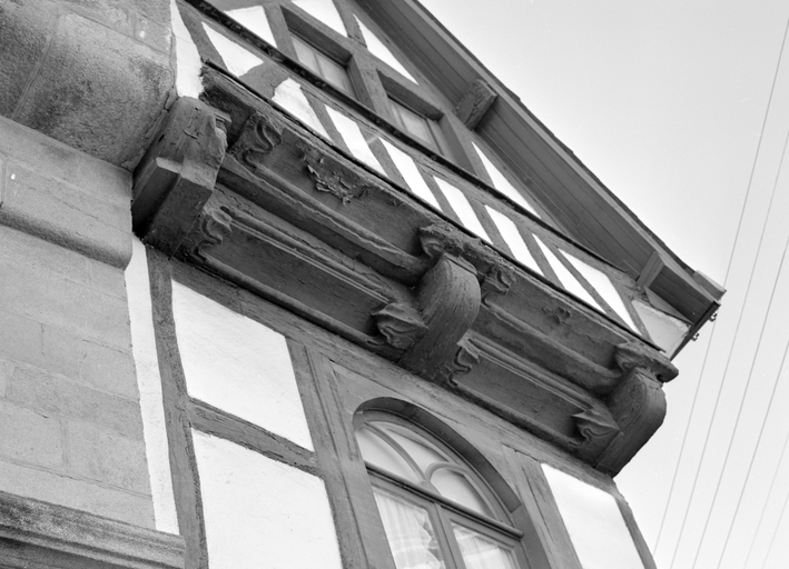 Elévation antérieure, détail des entretoises du second niveau à congé en forme de feuilleImmatriculation