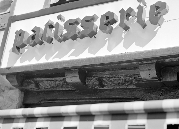 Elévation antérieure : encorbellement du 1er niveau avec entretoises à godronsImmatriculation