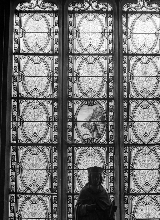 Verrière (9) : scènes des apparitions de la Vierge à Lourdes, verrière à personnages, chapelle Notre-Dame-de-Lourdes (Auray),