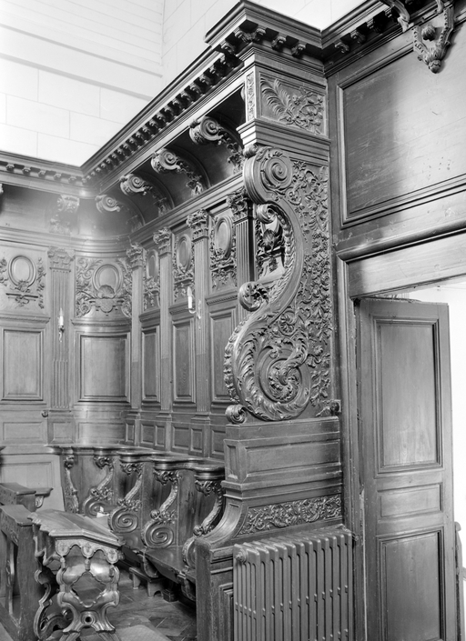 Stalles et lambris de choeur, volutes encadrant la porte d'entrée du choeur.Immatriculation