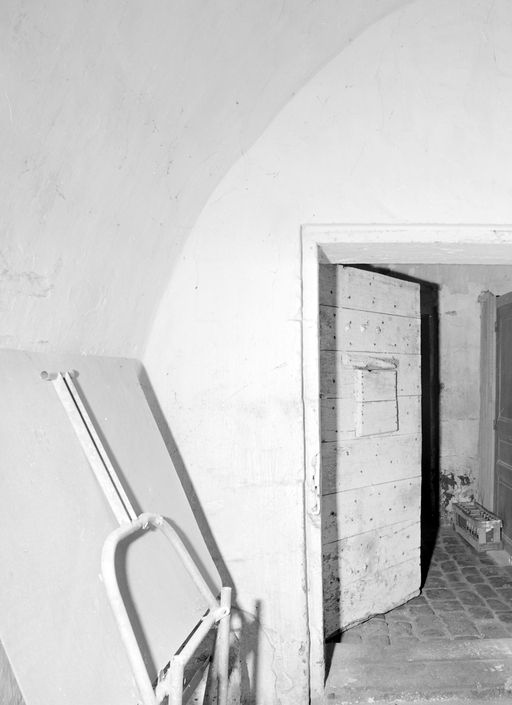 Cachot du rez-de-chaussée sud, détail couloir et porte d'entrée.Immatriculation