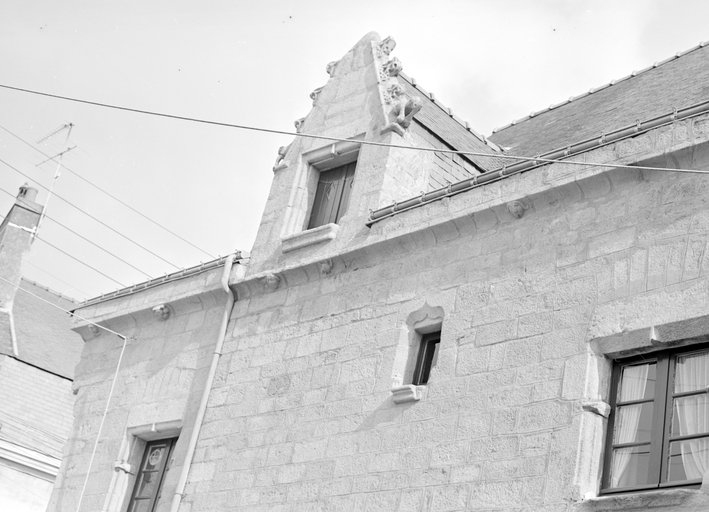 Rue aux Fèves, lucarne et corniches ornées.Immatriculation