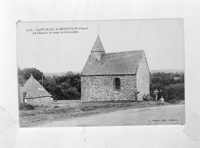 Reproduction carte postale : la chapelle du camp de Coëtquidan.Immatriculation