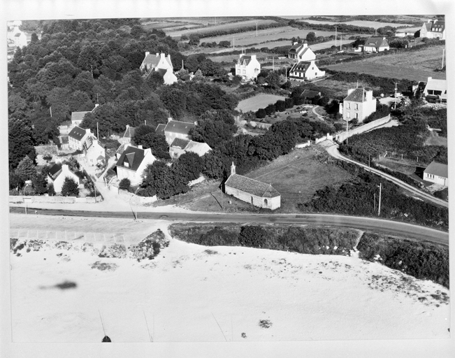 Vue aérienne sud-est : Chapelle et village de Landrevet. (1979)Immatriculation
