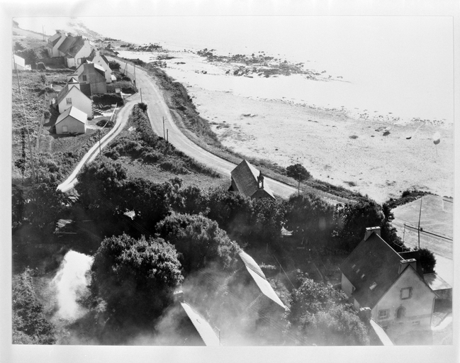 Vue aérienne ouest : Chapelle et village de Landrevet. (1979)Immatriculation