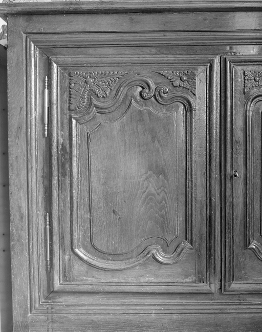 Bas de buffet daté 1770, détail d'un vantail. (1979)Immatriculation