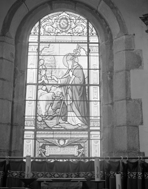 Verrière : saint Cornély bénissant les bestiaux, verrière historiée, église paroissiale Saint-Cornély (Gourlizon),