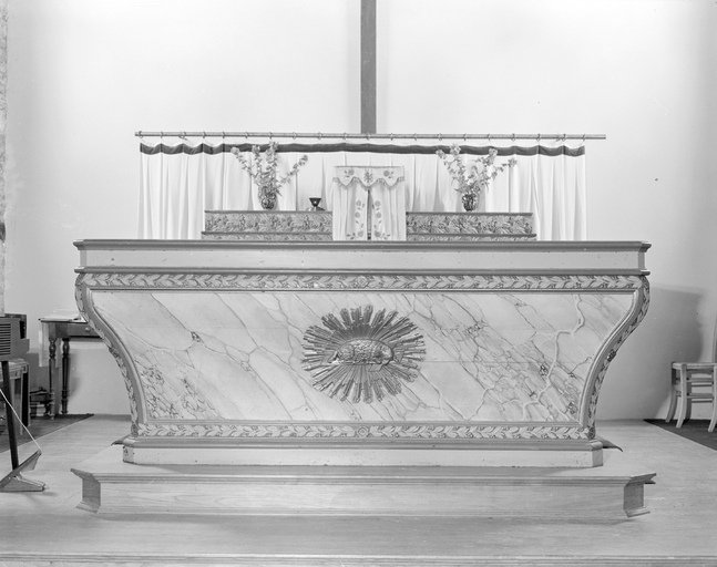 Autel, tabernacle, gradins d'autel (2) (maître-autel, autel tombeau), église paroissiale Saint-Goulven (Goulien),