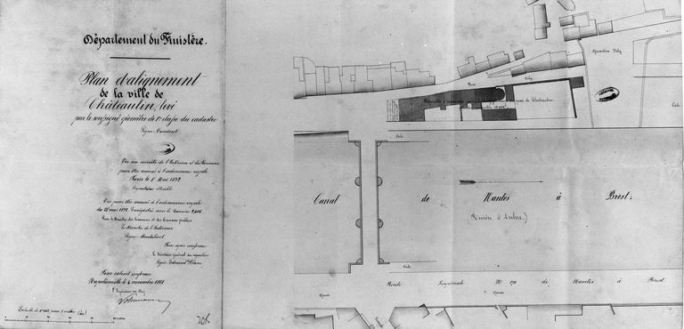 Département du Finistère. Plan d'alignement de la ville de Châteaulin, levé par le soussigné géomètre de 1ère classe du cadastre. Plan, par Taconnet, géomètre du cadastre, [vers 1832]. Papier, encre, aquarelle ; échelle : 1 : 500.
