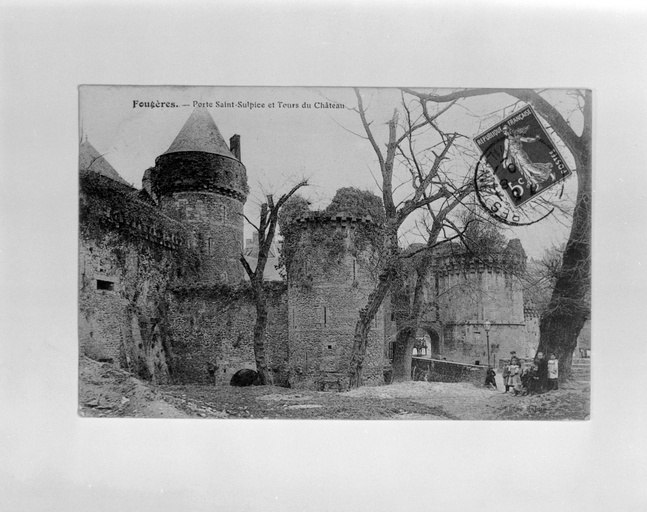 Eglise Saint Sulpice et tours du château, vue générale, carte postale ancienne.Immatriculation