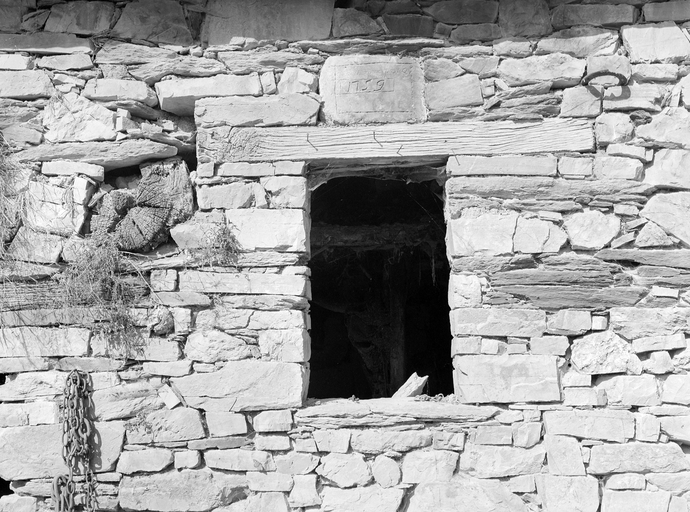 Vue de détail de la fenêtre et de la pierre datée.Immatriculation