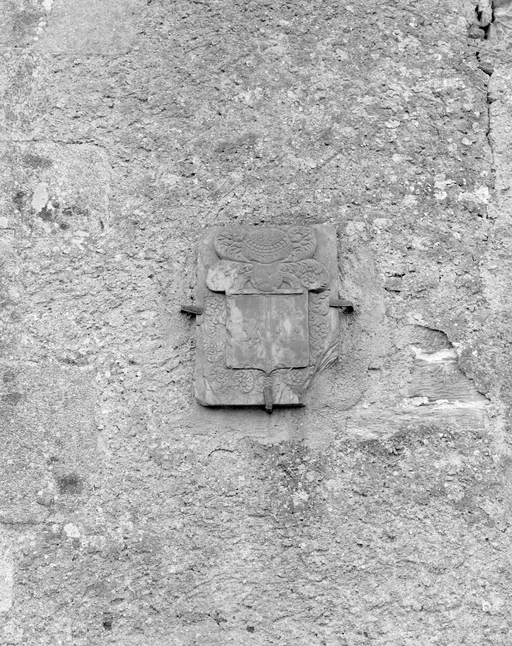 Vue de détail de la pierre armoriée apposée sur le logis.Immatriculation