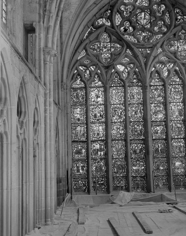 Verrière de la baie 100 (verrière légendaire) : Jugement dernier, Vie du Christ, Histoire d'Abraham, Vie de sainte Catherine, Vie de sainte Marguerite, évocation des évêques de Dol,