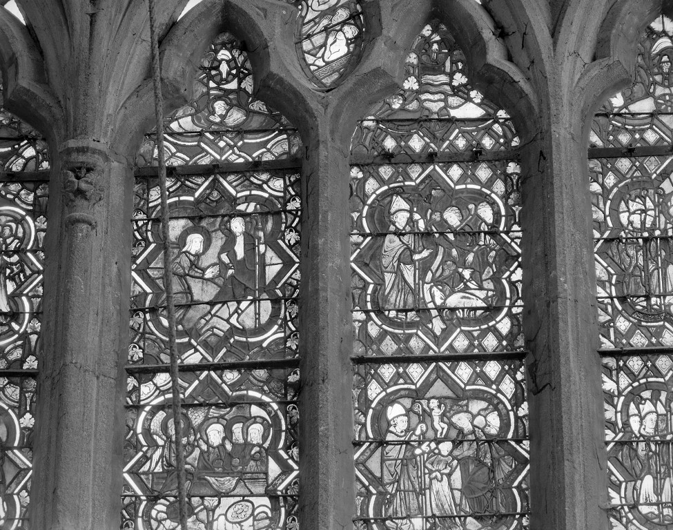 Verrière de la baie 100 (verrière légendaire) : Jugement dernier, Vie du Christ, Histoire d'Abraham, Vie de sainte Catherine, Vie de sainte Marguerite, évocation des évêques de Dol,