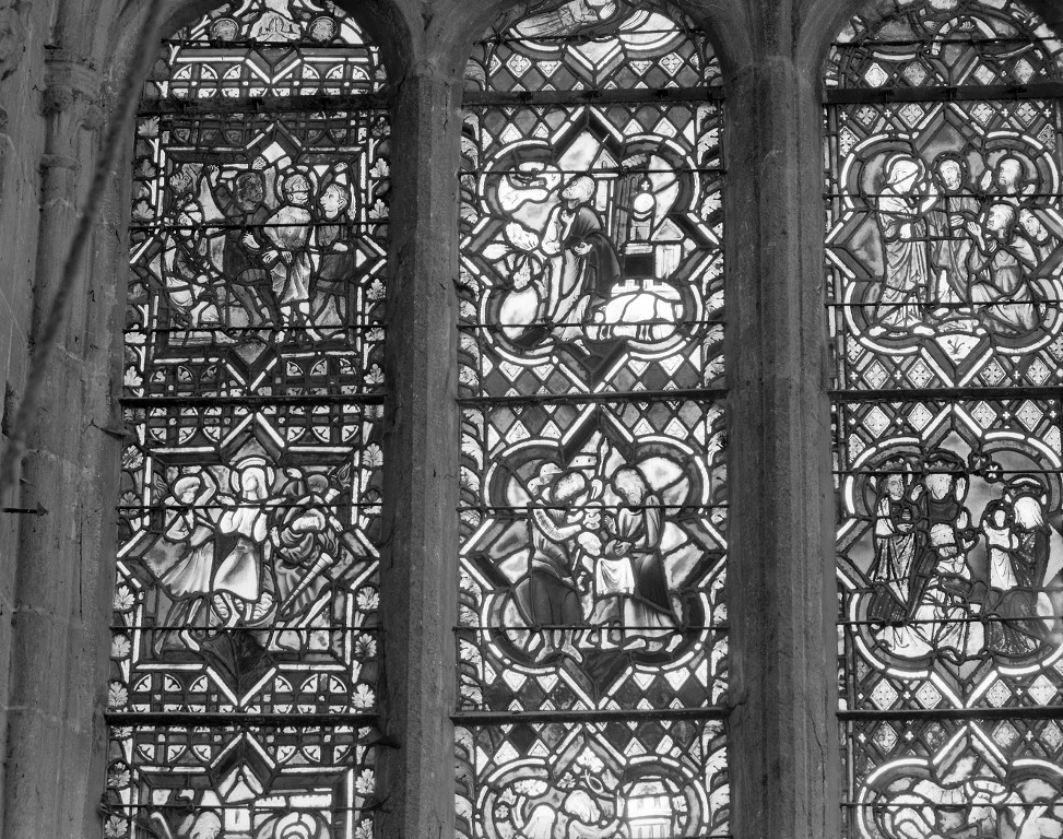 Verrière de la baie 100 (verrière légendaire) : Jugement dernier, Vie du Christ, Histoire d'Abraham, Vie de sainte Catherine, Vie de sainte Marguerite, évocation des évêques de Dol,