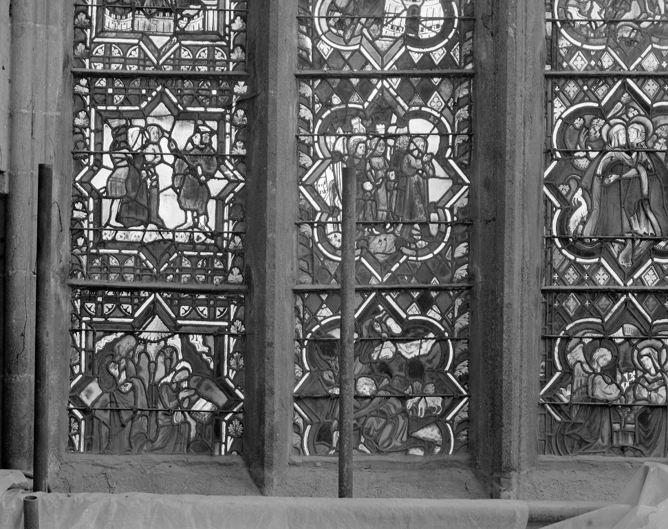 Vue de détail des panneaux a1, b1. 1ère et 2e lancettes, 1er et 2e registres : vue généraleImmatriculation