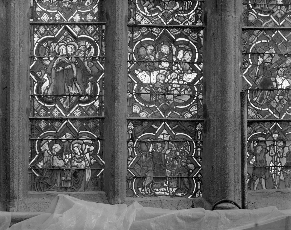 Vue de détail des panneaux c1, c2, d1 et d2. 3e et 4e lancettes, 1er et 2e registres : vue généraleImmatriculation