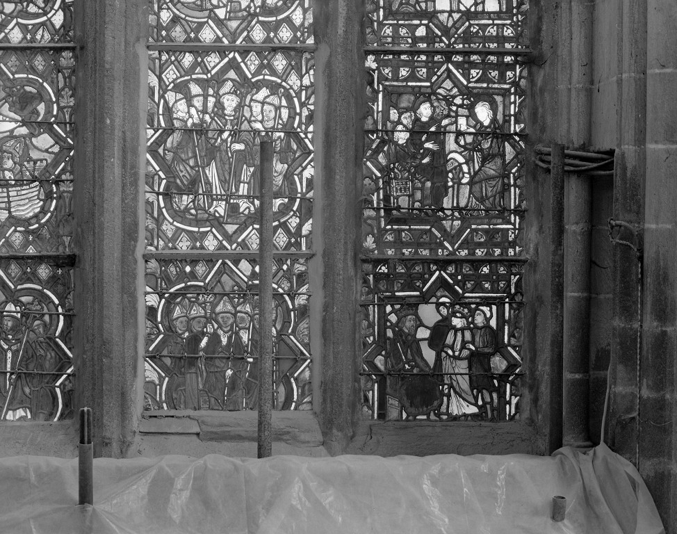 Verrière de la baie 100 (verrière légendaire) : Jugement dernier, Vie du Christ, Histoire d'Abraham, Vie de sainte Catherine, Vie de sainte Marguerite, évocation des évêques de Dol,