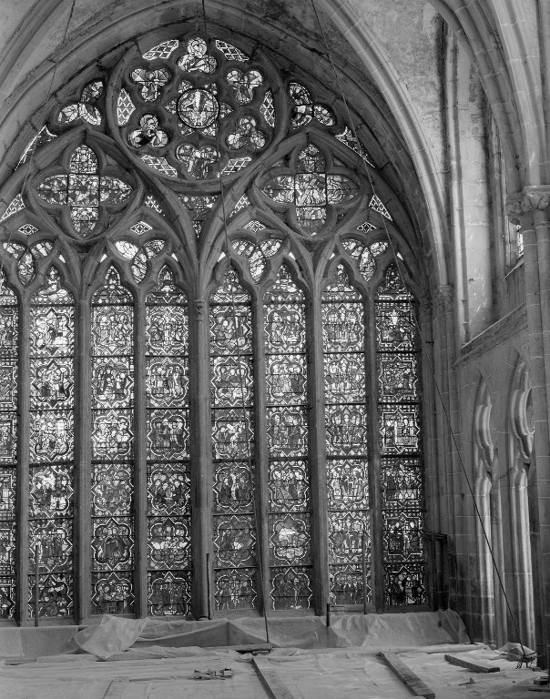 Verrière de la baie 100 (verrière légendaire) : Jugement dernier, Vie du Christ, Histoire d'Abraham, Vie de sainte Catherine, Vie de sainte Marguerite, évocation des évêques de Dol,