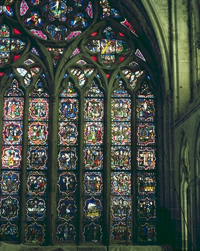 Verrière de la baie 100 (verrière légendaire) : Jugement dernier, Vie du Christ, Histoire d'Abraham, Vie de sainte Catherine, Vie de sainte Marguerite, évocation des évêques de Dol,