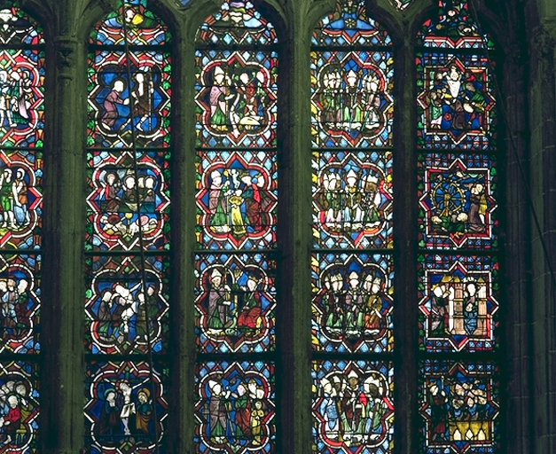 Verrière de la baie 100 (verrière légendaire) : Jugement dernier, Vie du Christ, Histoire d'Abraham, Vie de sainte Catherine, Vie de sainte Marguerite, évocation des évêques de Dol,